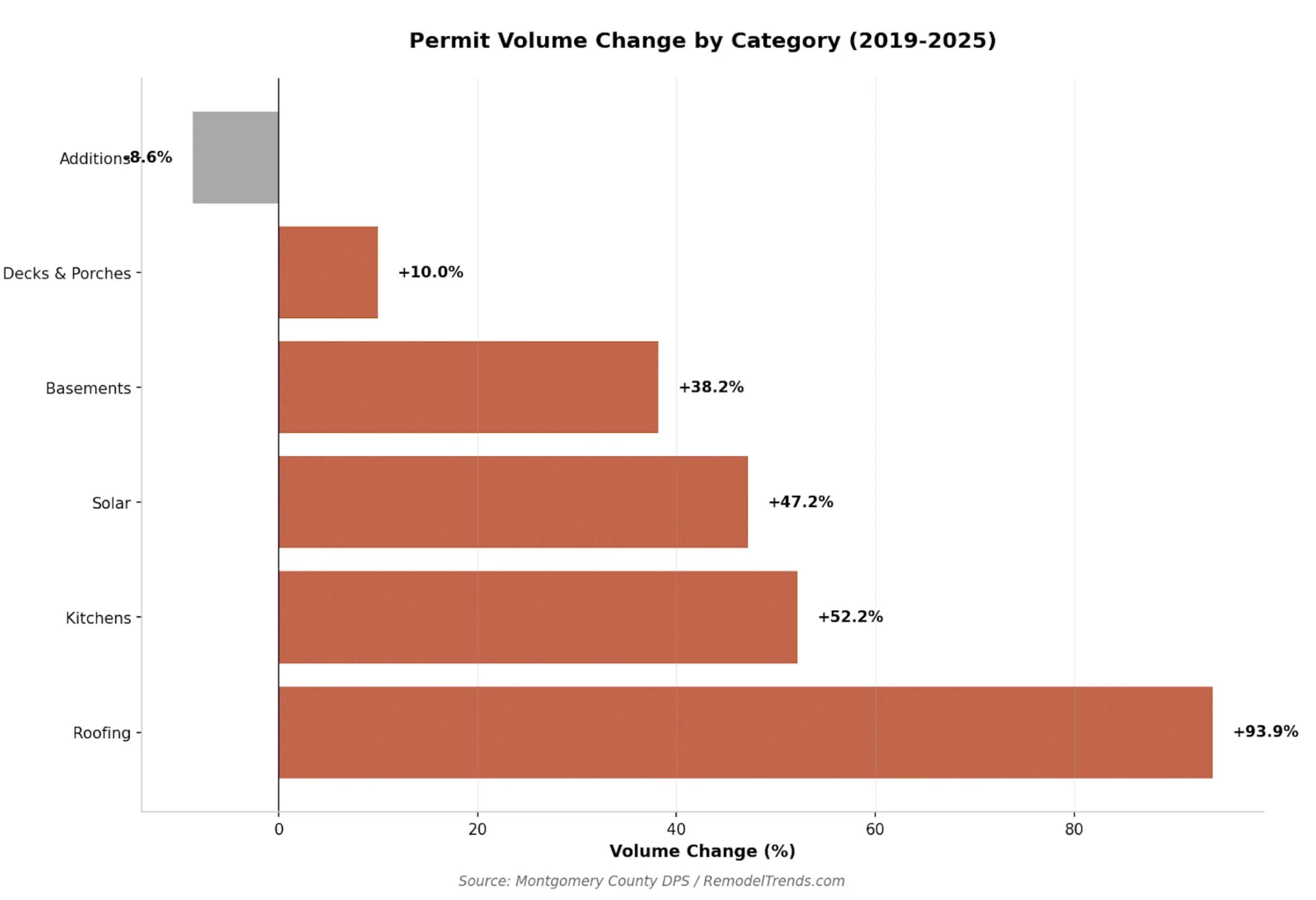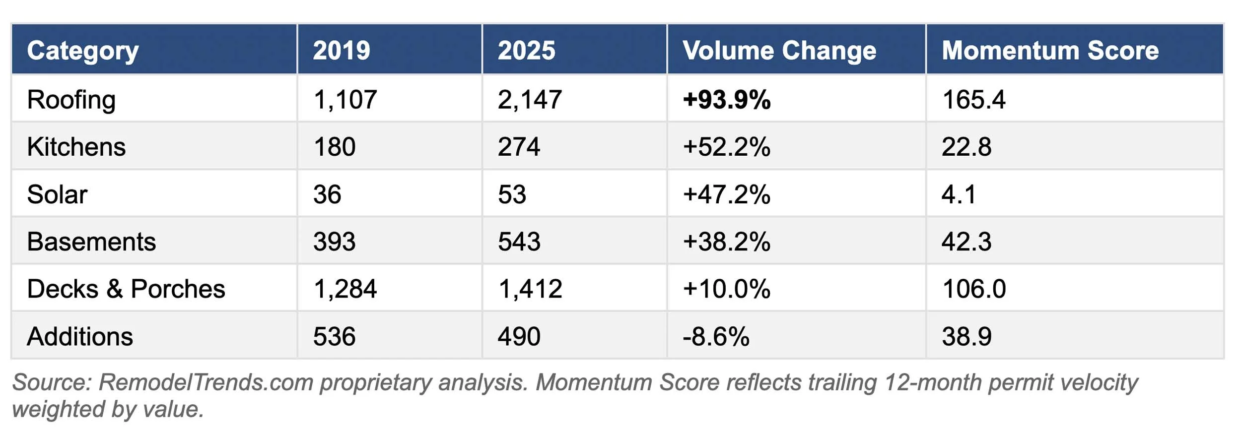 Among all remodeling categories, roofing stands out as the dominant growth driver. Permitted roofing projects rose 94% from 2019 to 2025, far outpacing every other category. Kitchens followed at 52%, basements at 38%, and decks at 10%. Meanwhile, windows and doors actually declined 19%, suggesting homeowners are prioritizing envelope and structural upgrades over cosmetic ones.