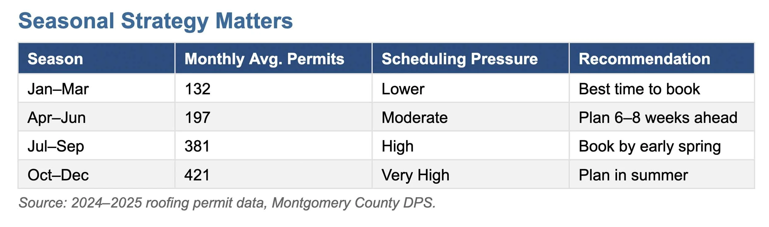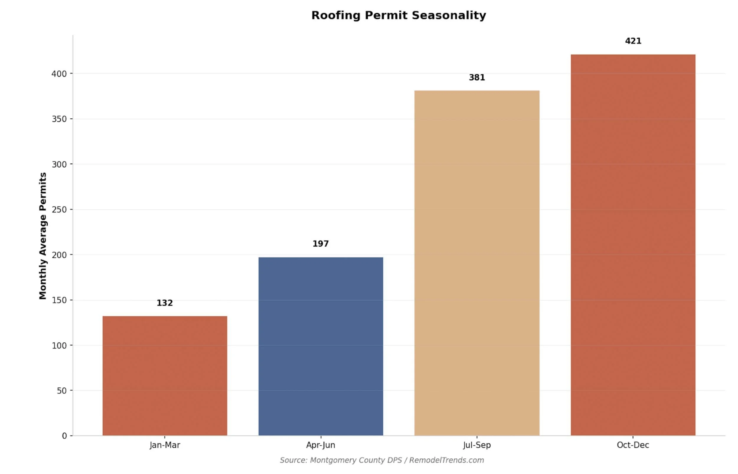 With 2,147 roofing permits issued in 2025 — up from 1,107 in 2019 — the demand for qualified roofing contractors in Montgomery County has nearly doubled. This has real consequences for homeowners planning a project. Wait times for estimates have lengthened, preferred scheduling windows fill faster, and the fall season (historically the busiest for roofing) now sees a sharp spike: October and November 2025 each saw over 250 permits filed, compared to typical monthly volumes of 100–130 in prior years.