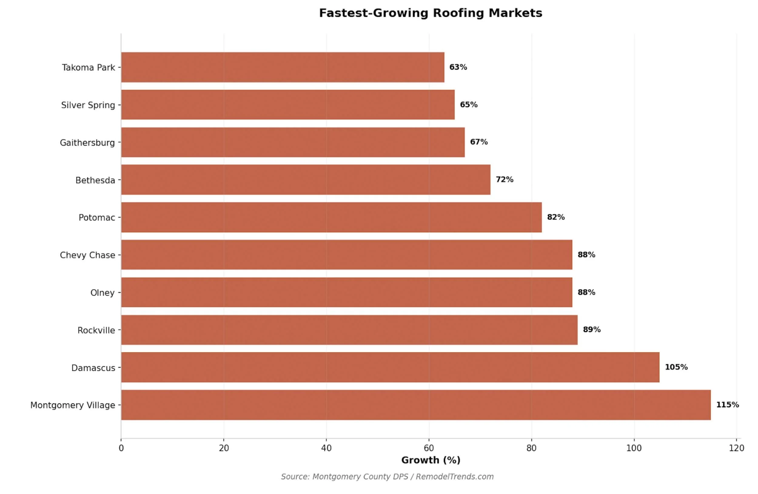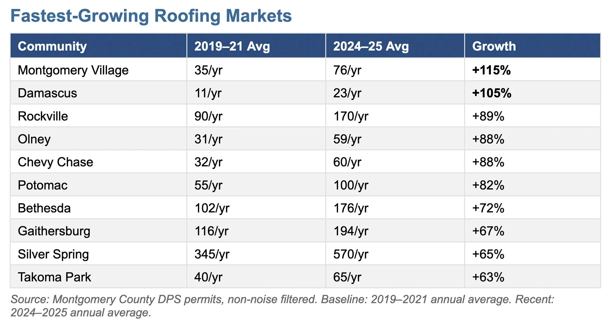 Silver Spring alone accounted for 570 roofing permits per year in the 2024–2025 period — up from 345 pre-pandemic. That is roughly 11 new roofing projects starting every single week in one community. Bethesda, Rockville, and Gaithersburg each saw increases exceeding 65%.