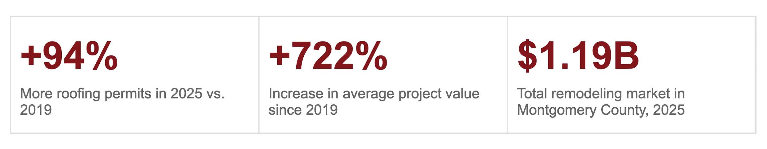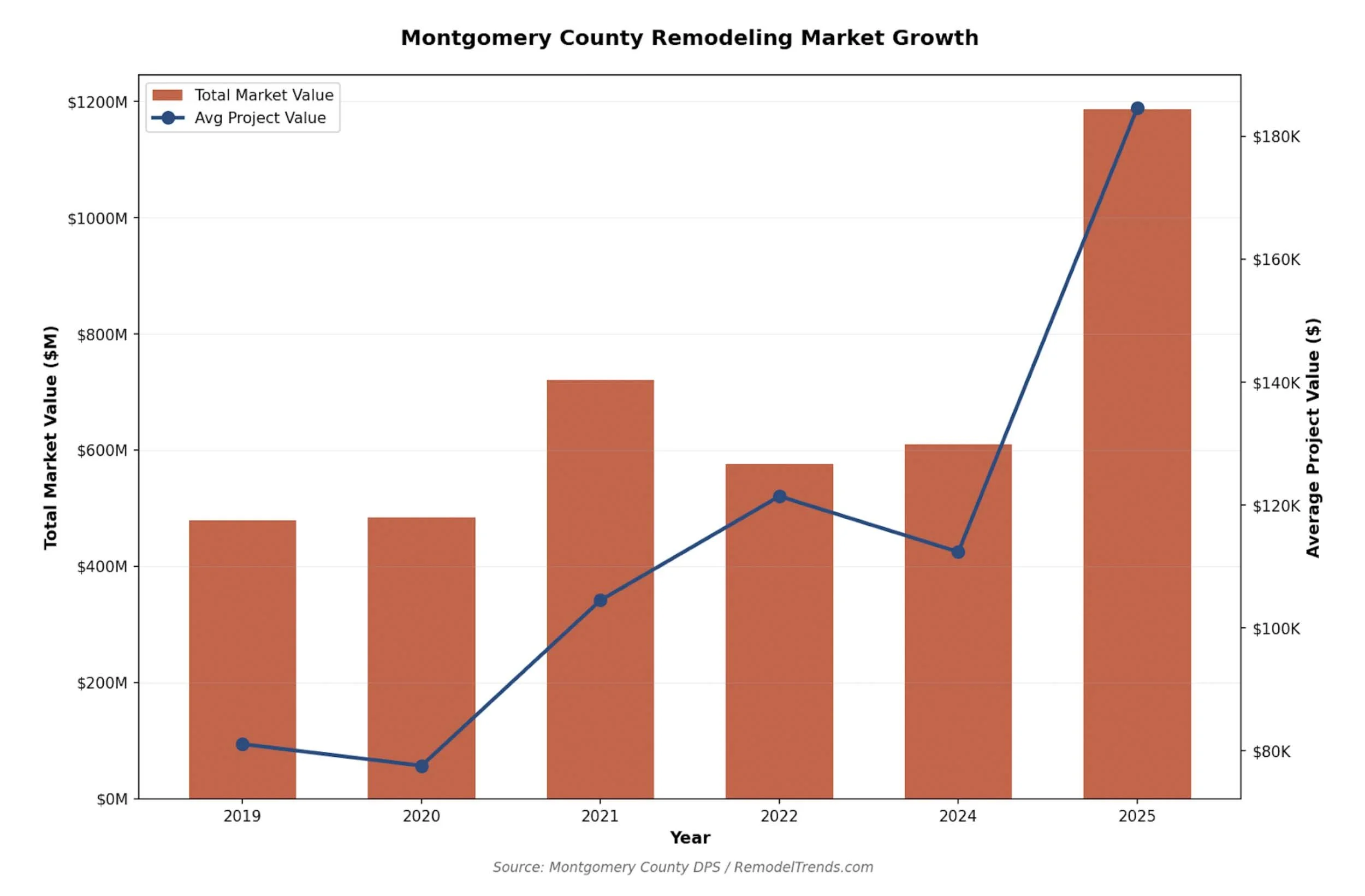 Montgomery County’s total permitted remodeling market — spanning roofing, additions, kitchens, basements, decks, and more — grew from $479 million in 2019 to $1.19 billion in 2025. That is not an incremental increase. It represents a fundamental change in how much homeowners are investing in their properties.