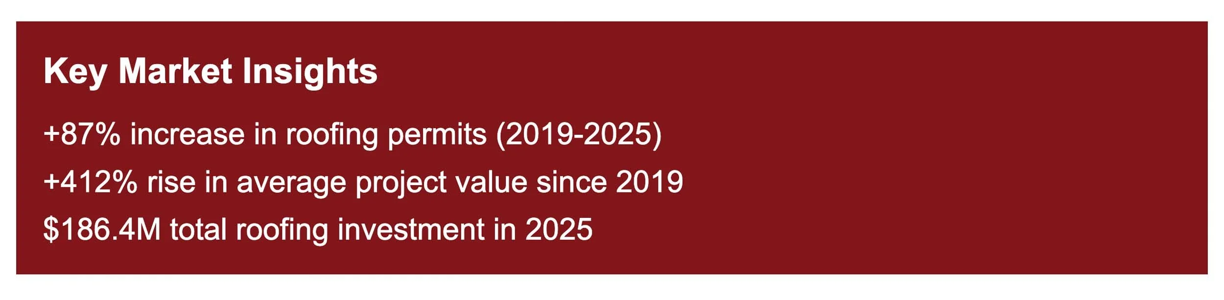 Roofing permits surged 87% between 2019 and 2025, climbing from 1,842 to 3,449 annual filings. Average project values rose from $12,400 to $54,100 over the same period, reflecting a dramatic shift toward premium materials and comprehensive replacement over patch repairs. The total roofing market in Prince George's County reached $186.4 million in 2025.